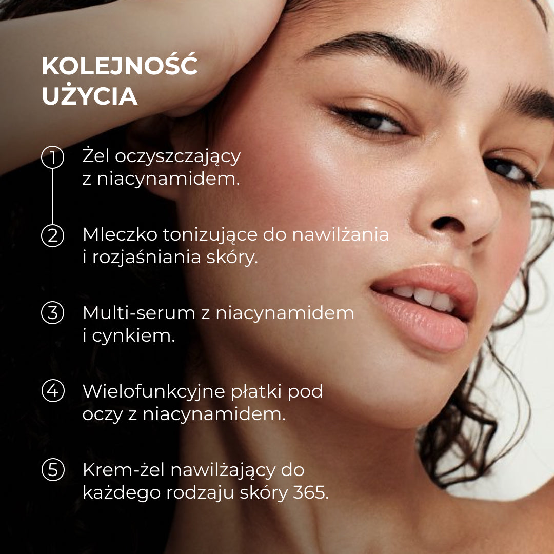 Delikatny żel do mycia twarzy na bazie niacynamidu skutecznie usuwa zanieczyszczenia i resztki makijażu, nie przesuszając i nie podrażniając skóry. Niacynamid kontroluje wydzielanie sebum, redukuje zaczerwienienia i stany zapalne, zwalcza oznaki potrądzikowe, poprawia strukturę skóry i wspomaga jej rozjaśnianie. Sok z aloesu, pantenol i witamina E łagodzą skórę, zmniejszają podrażnienia i nawilżają. Olej babassu zawarty w formule nie wysusza skóry, a wręcz zapewnia uczucie zadbanej skóry już na etapie oczyszczania.
