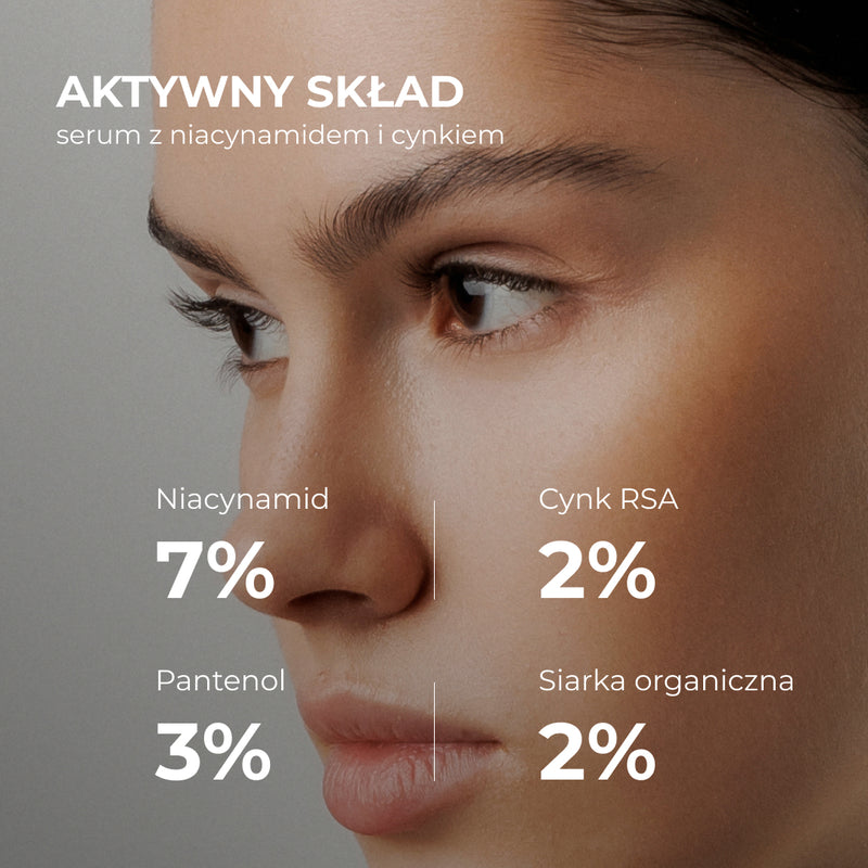 Niacynamid 7% + Cynk PCA 2% + Pantenol 3% + Organiczna siarka 2%