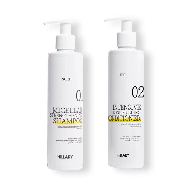 Zestaw Hillary Intensive Nori Bond Building Strengthening do wszystkich rodzajów włosów bazuje na unikalnym kompleksie Nori matrix z alg brunatnych, który poprawia integralność strukturalną włosów, zmniejsza ich łamliwość, znacznie zwiększa elastyczność i wytrzymałość włókien włosowych.