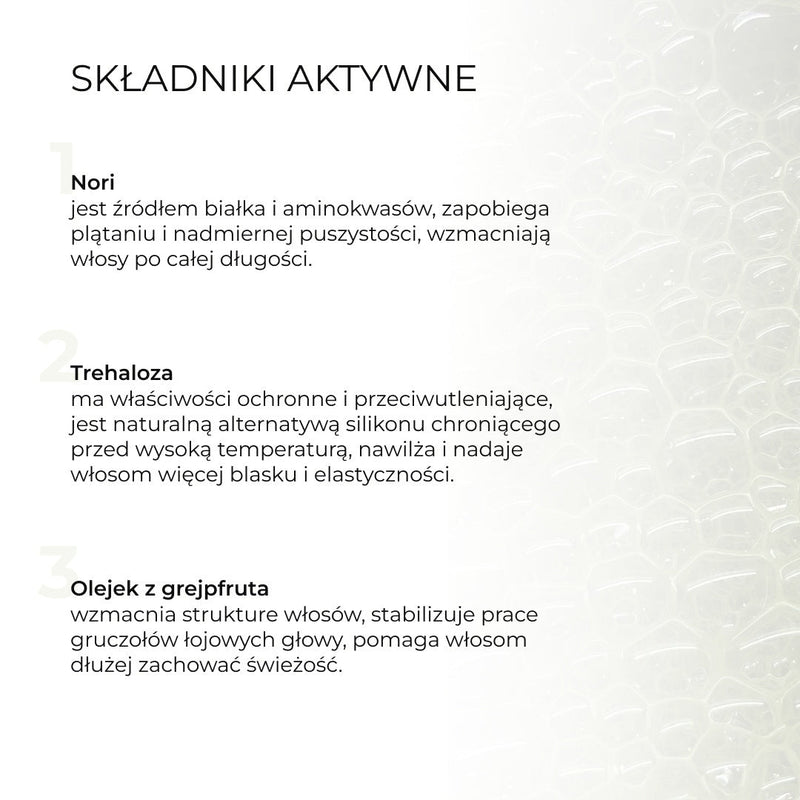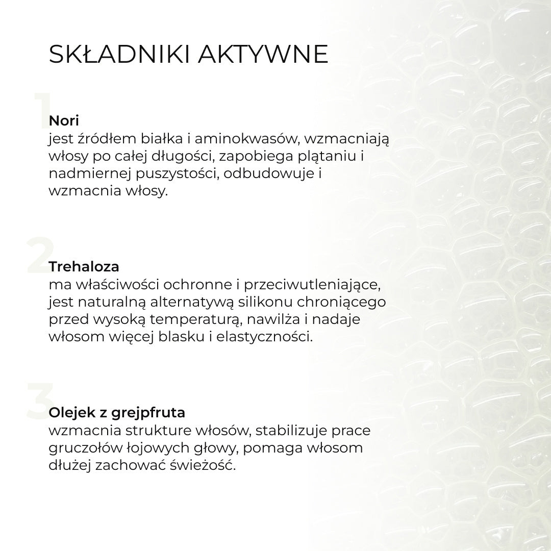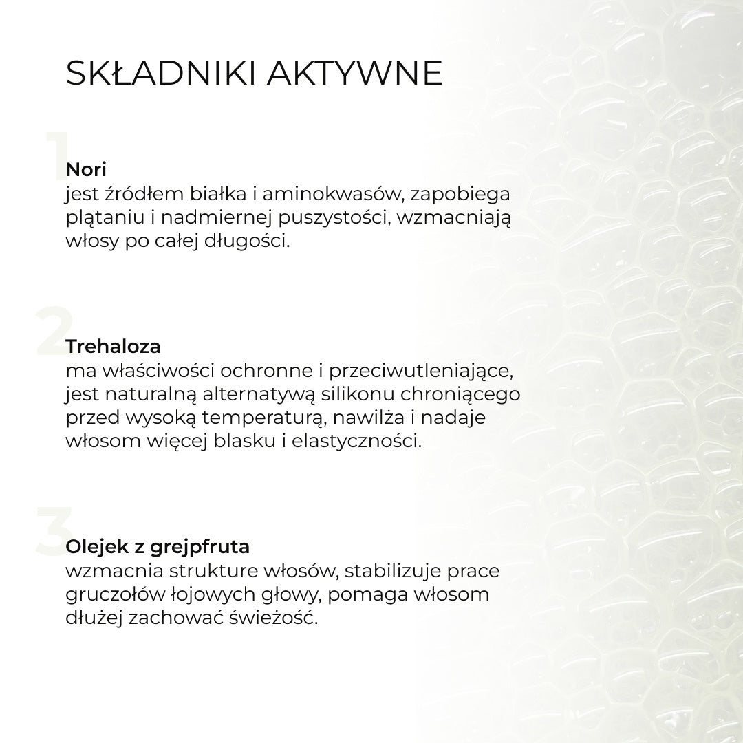 Proste włosy stają się podatne na układanie i łatwiej się rozczesują. Zapobiega utracie wilgoci, wypełnia naturalnym blaskiem, wzmacnia włosy na całej długości.