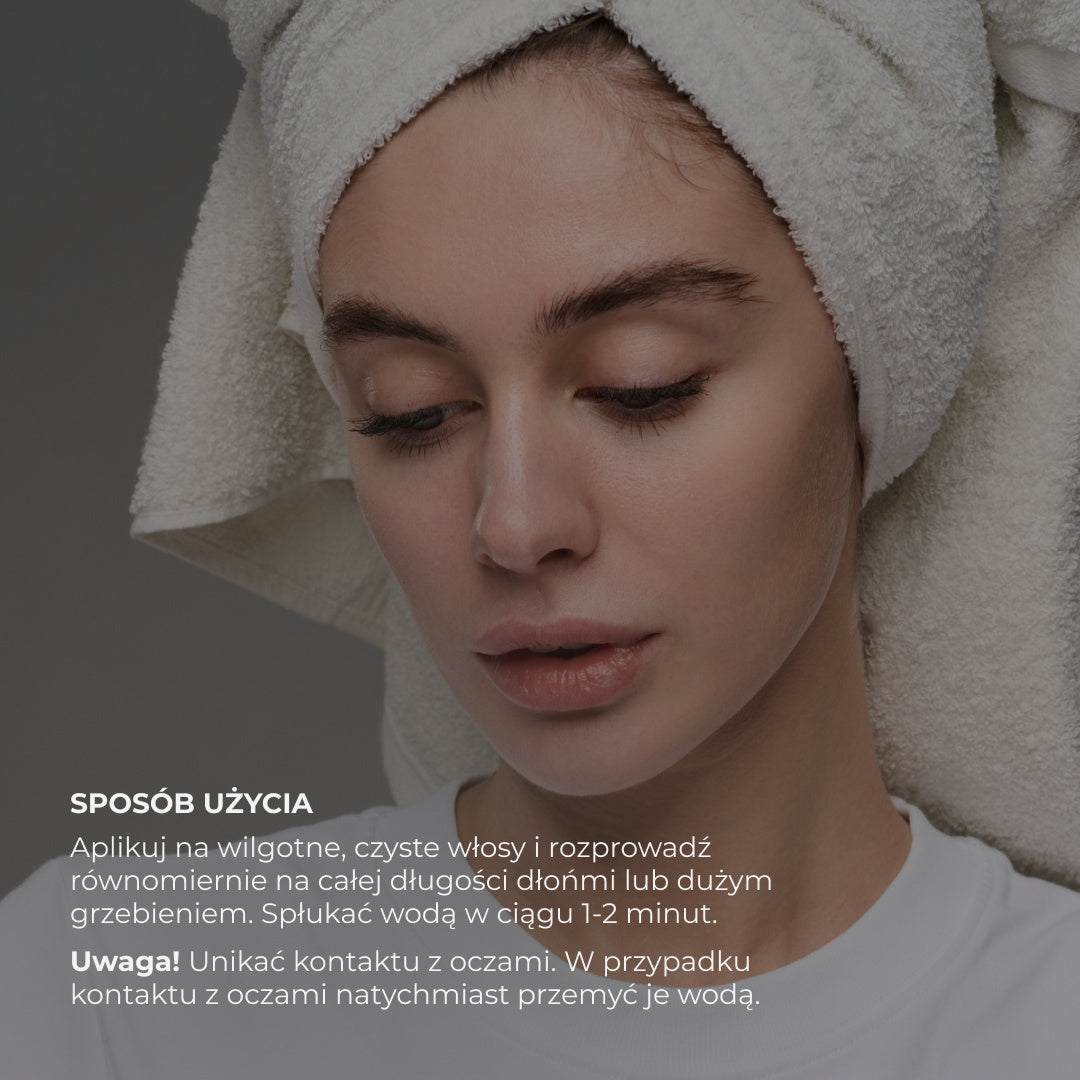 - Nałóż odżywkę na wilgotne, czyste włosy i rozprowadz równomiernie na całej długości dłońmi lub dużym grzebieniem. Zmyj wodą po 1-2 minutach.