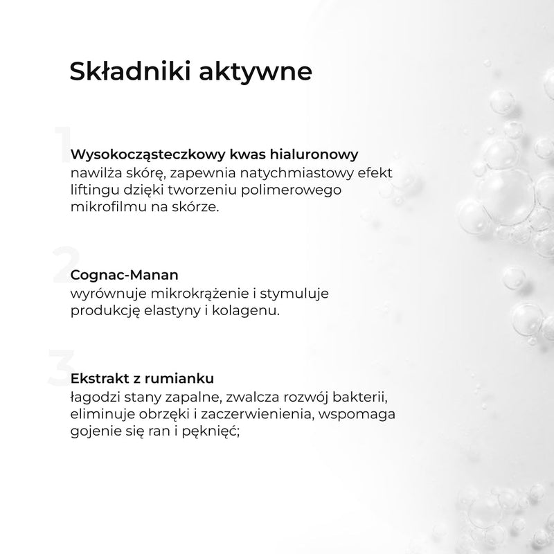 Serum hialuronowe nawilża głębokie warstwy skóry, zapobiega starzeniu i przywraca młodość, odbudowuje i chroni, zatrzymuje wilgoć wewnątrz skóry, wyraźnie redukuje zmarszczki, napina skórę i nadaje jej blasku. Podczas masażu właściwości serum hialuronowego są znacznie wzmocnione.