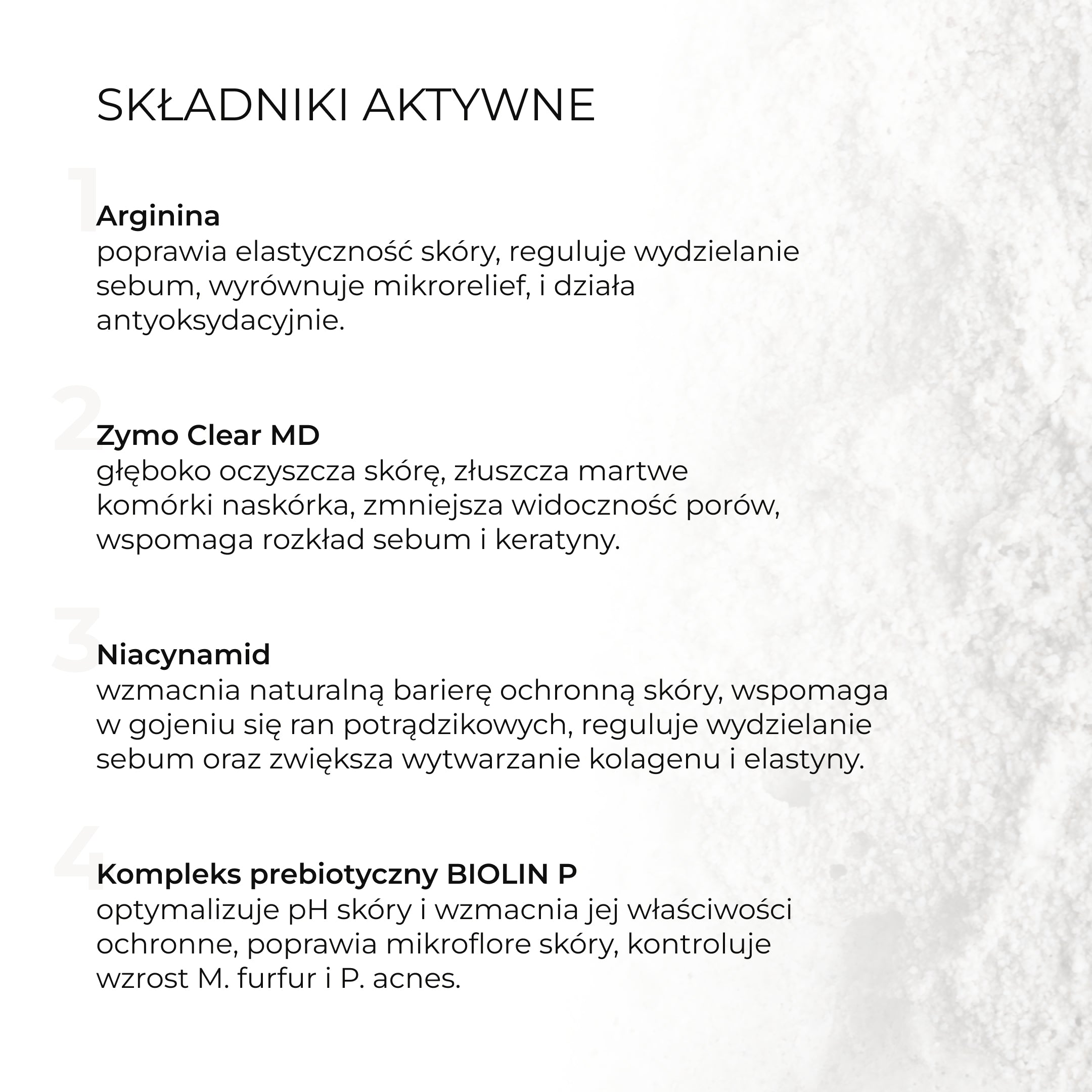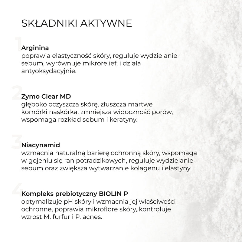 Zawiera organiczny prebiotyk, który równoważy mikrobiom skóry oraz niacynamid, który odbudowuje i nawilża.