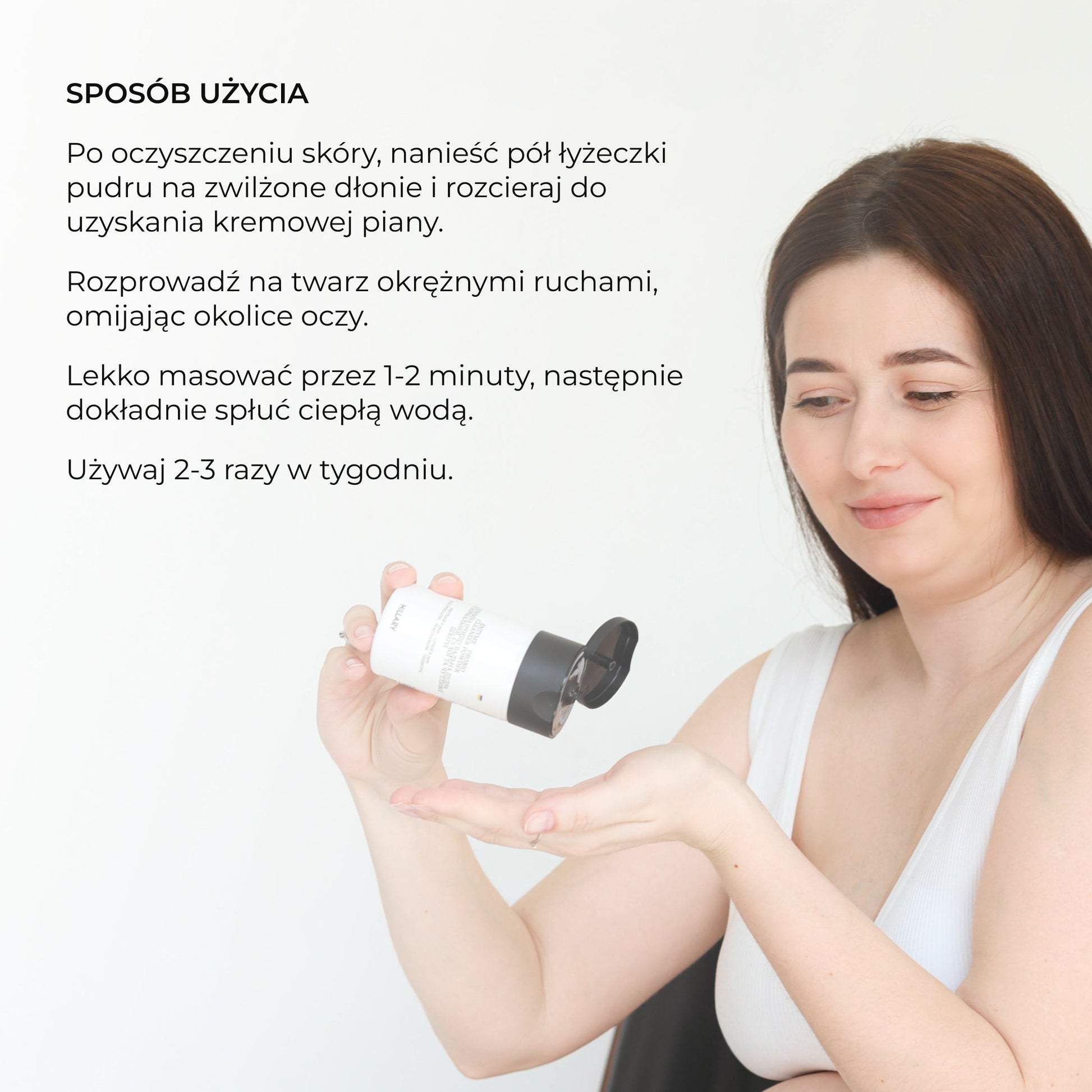 - Po oczyszczeniu skóry nałóż pół łyżeczki pudru na zwilżone dłonie i rozetrzyj, aż utworzy się kremowa pianka. Nakładaj na twarz okrężnymi ruchami, omijając okolice oczu. Lekko masować przez 1-2 minuty, a następnie dokładnie zmyj ciepłą wodą. Stosuj puder 1-2 razy w tygodniu.