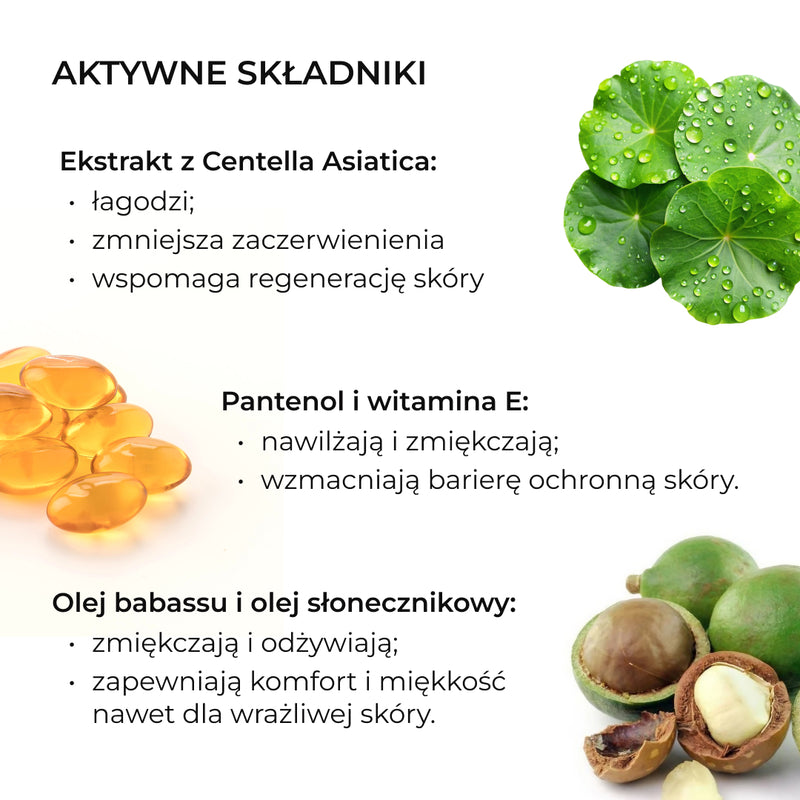 Ekstrakt Centella Asiatica łagodzi, redukuje zaczerwienienia i wspomaga regenerację skóry. Pantenol oraz witamina E nawilżają, zmiękczają i wzmacniają barierę ochronną, a olej babassu zapewnia skórze komfort i miękkość.
