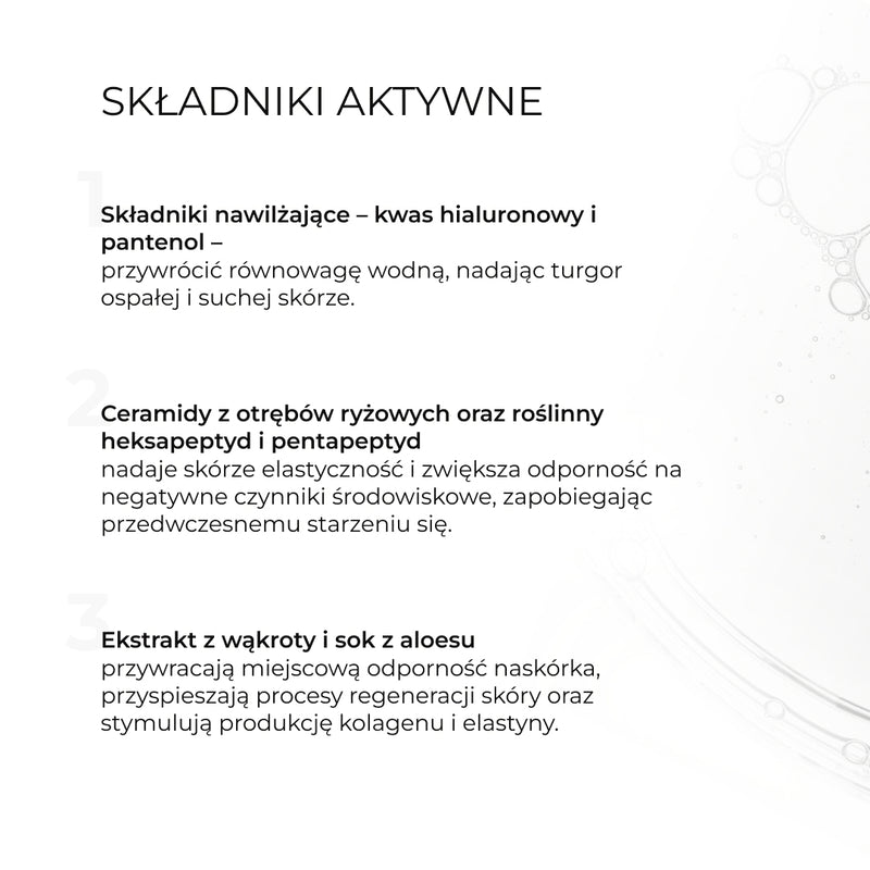 Składniki nawilżające, takie jak kwas hialuronowy i pantenol, przywracają równowagę wodną skóry, nadając jędrność skórze zmęczonej i suchej.