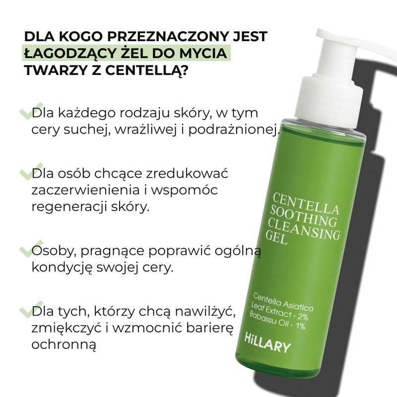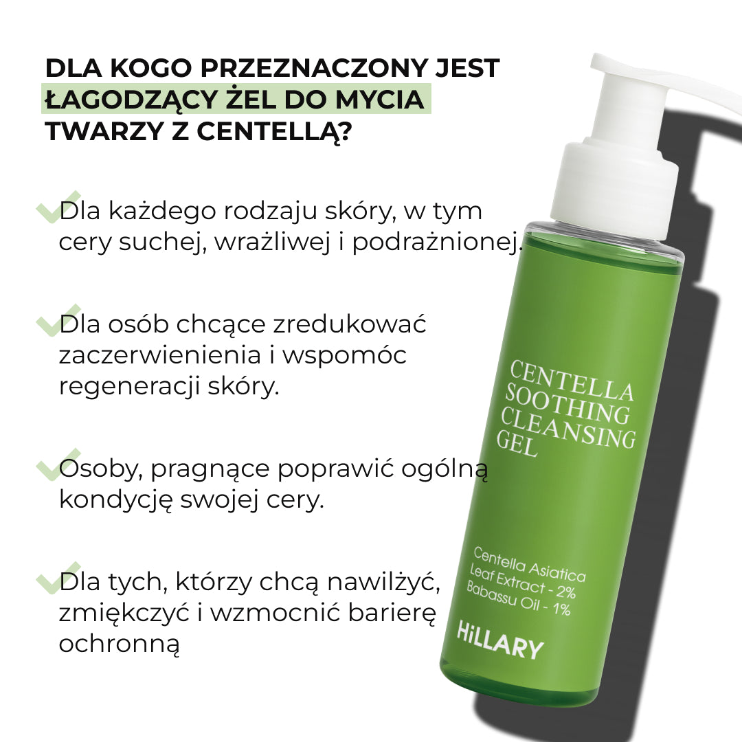 Skład produktu: Łagodzący żel do mycia twarzy z centellą Hillary Centella Soothing Cleansing Gel, 100 ml Ampułkowe serum z centellą Hillary Ampoule Centella Serum, 30 ml