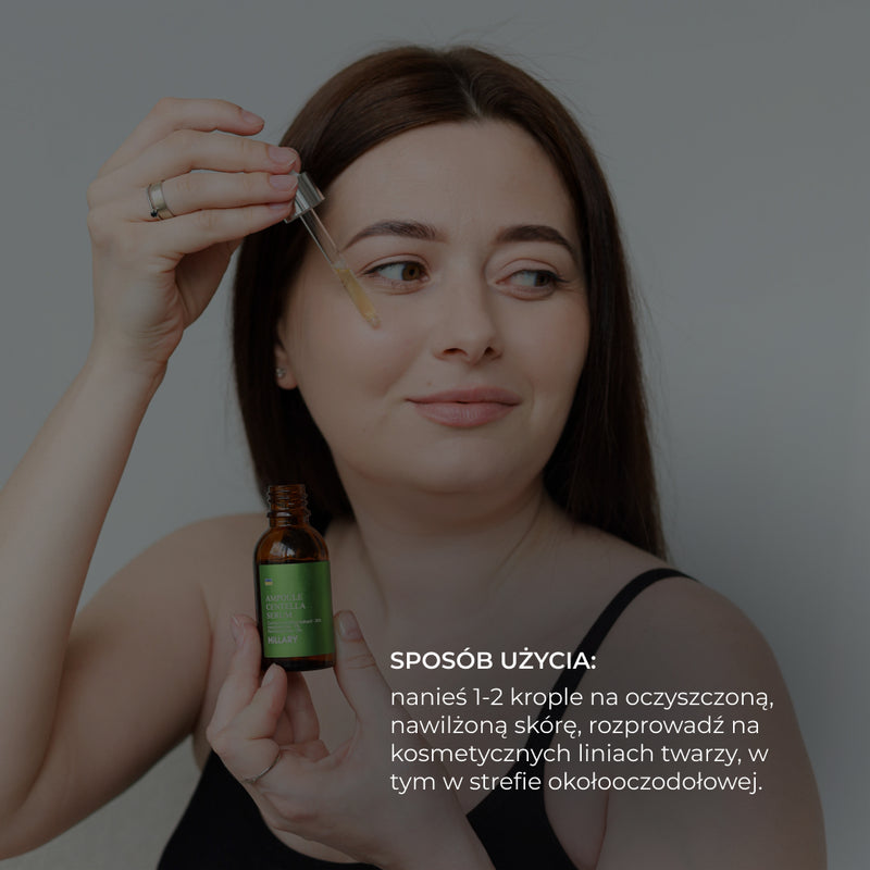 - Nałóż ampułkowe serum z centellą na oczyszczoną i nawilżoną skórę – 1–2 krople, rozprowadzić zgodnie z liniami kosmetycznymi twarzy, z wyłączeniem okolic oczu.