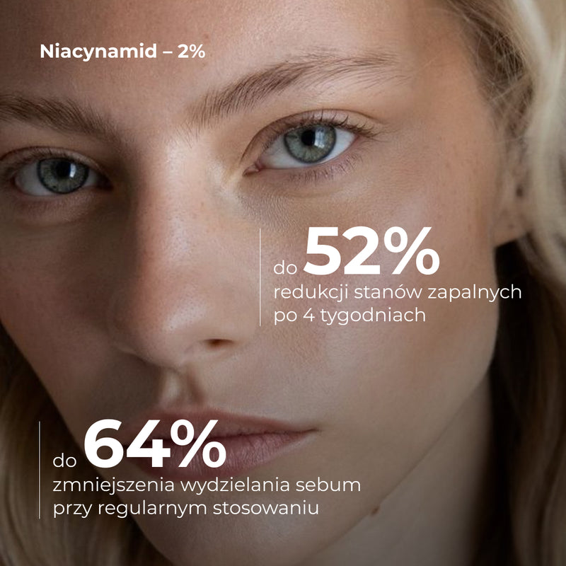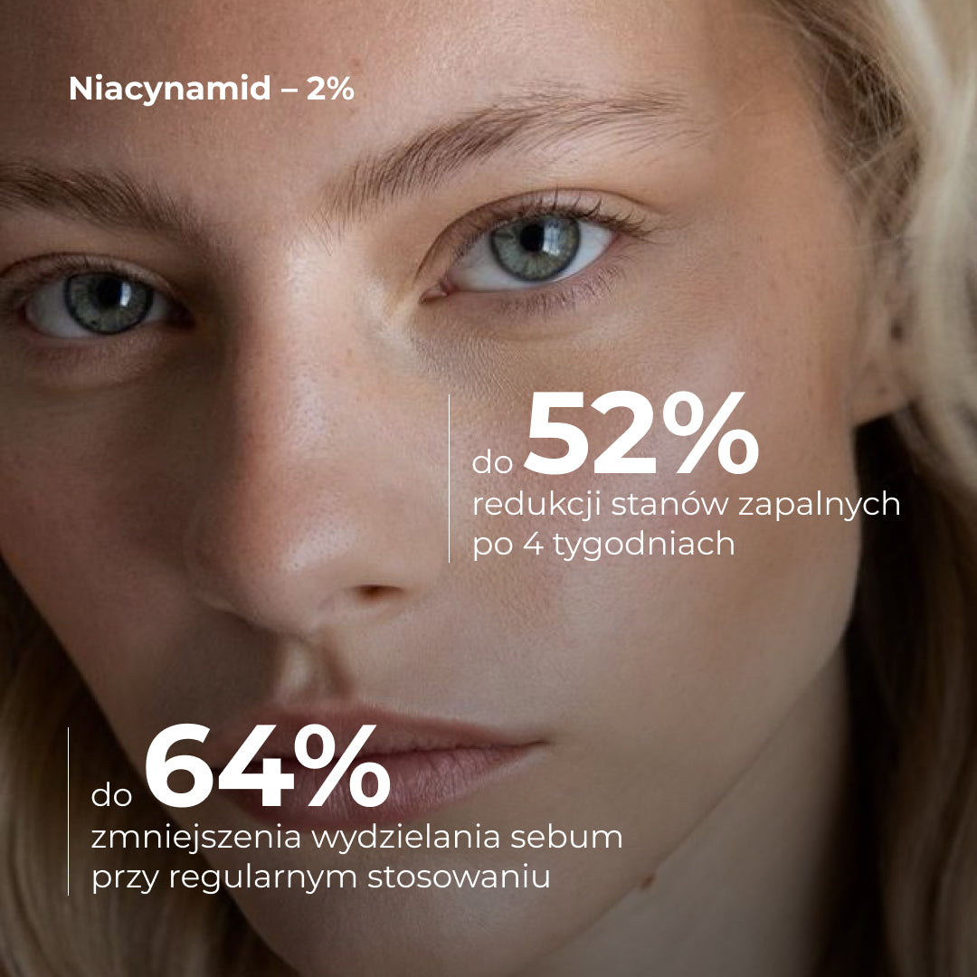 Przy regularnym stosowaniu żelu zawierającego 2% niacynamidu zaobserwowano 64% redukcję wydzielania sebum, a liczba stanów zapalnych zmniejszyła się o 52% już po 4 tygodniach.