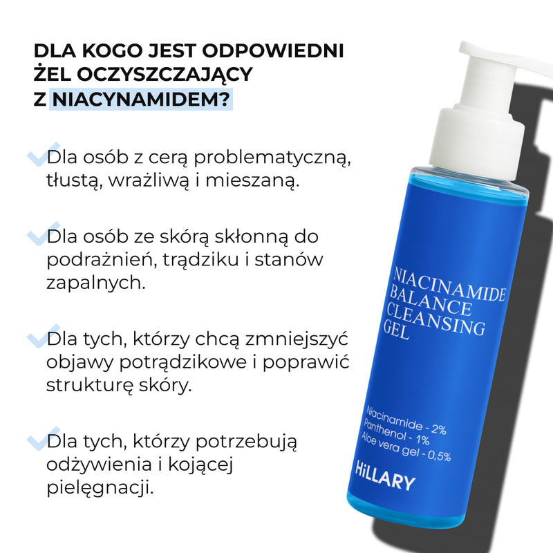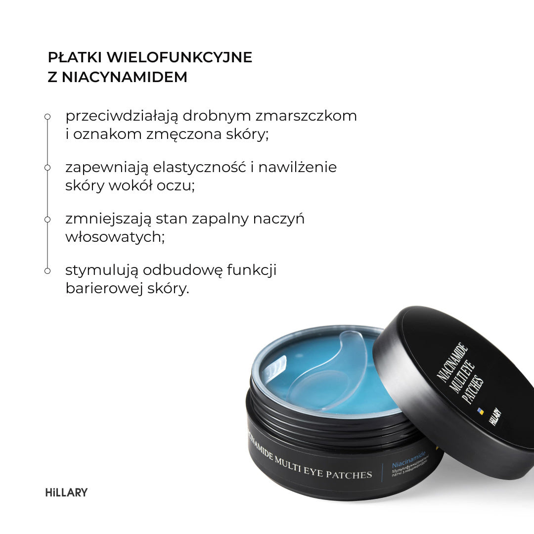 Skład produktu: Oczyszczający, balansujący żel do mycia twarzy z niacynamidem Hillary Niacinamide Balance Cleansing Gel, 100 ml Wielofunkcyjne plastry pod oczy z niacynamidem Hillary Niacinamide Multi Eye Patches, 60 szt. Multiserum z niacynamidem i cynkiem Hillary Multi Niacinamide Serum, 30 ml